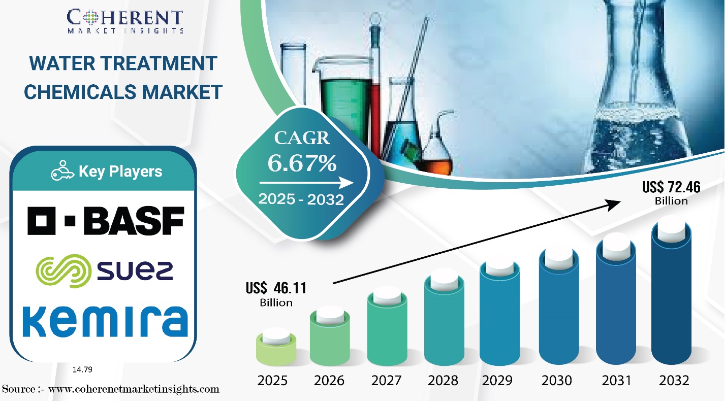 Burlingame, CA, Dec. 03, 2025 (GLOBE NEWSWIRE) -- The Global Water Treatment Chemicals Market is estimated to be valued at USD 46.11 Bn in 2025 and is expected to reach USD 72.46 Bn in 2032, exhibiting a compound annual growth rate (CAGR) of 6.67% from 2025 to 2032. Rapid urbanization, rising population levels, and expanding industrial activities are driving stronger demand for water treatment chemicals across both municipal and industrial sectors. Stringent environmental regulations—including EPA effluent standards, zero-liquid-discharge requirements, and PFAS restrictions—are pushing utilities and industries to adopt advanced coagulants, biocides, corrosion inhibitors, and next-generation scale control chemicals.